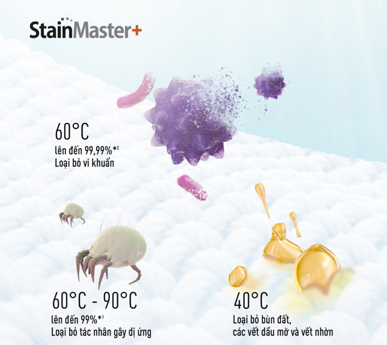 – Công nghệ StainMaster+: loại bỏ hiệu quả các vết bẩn cứng đầu (bùn đất, dầu mỡ,..), vi khuẩn và các tác nhân gây dị ứng nhờ công nghệ giặt nước nóng.
