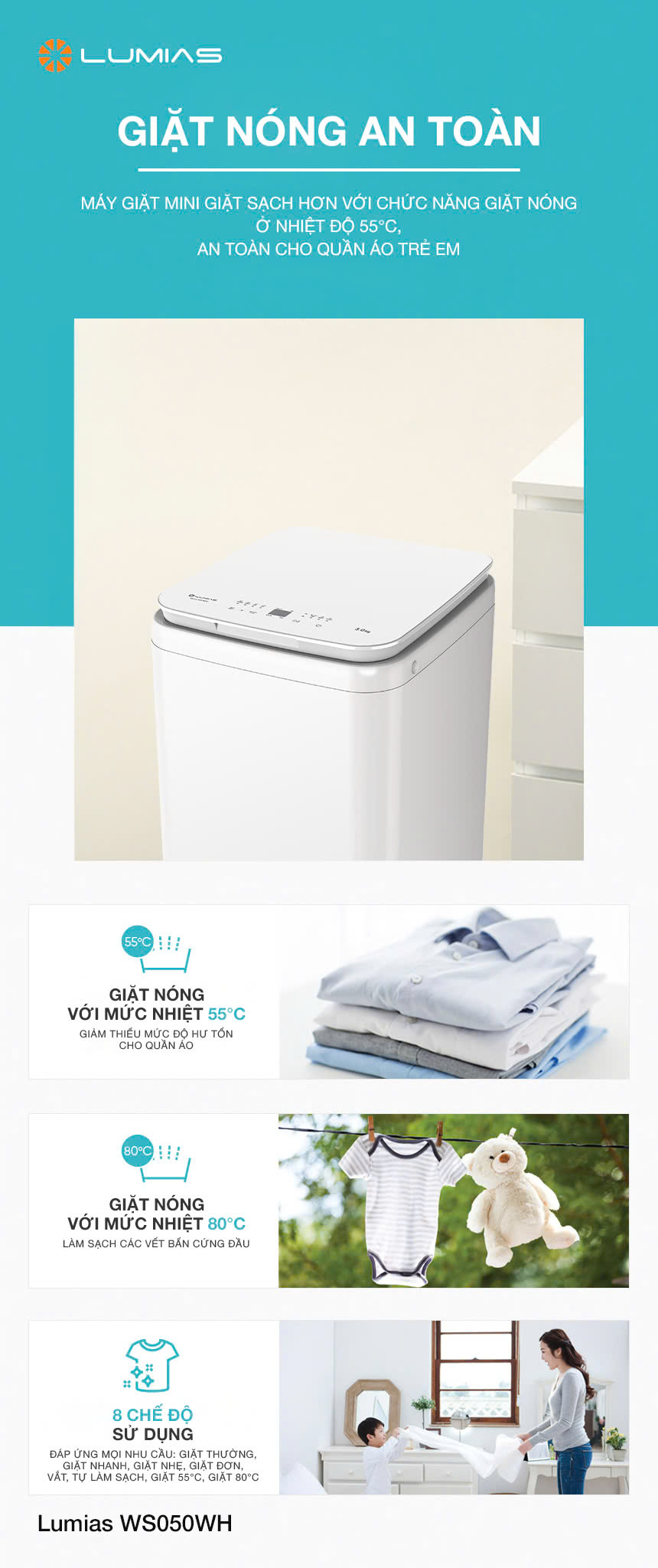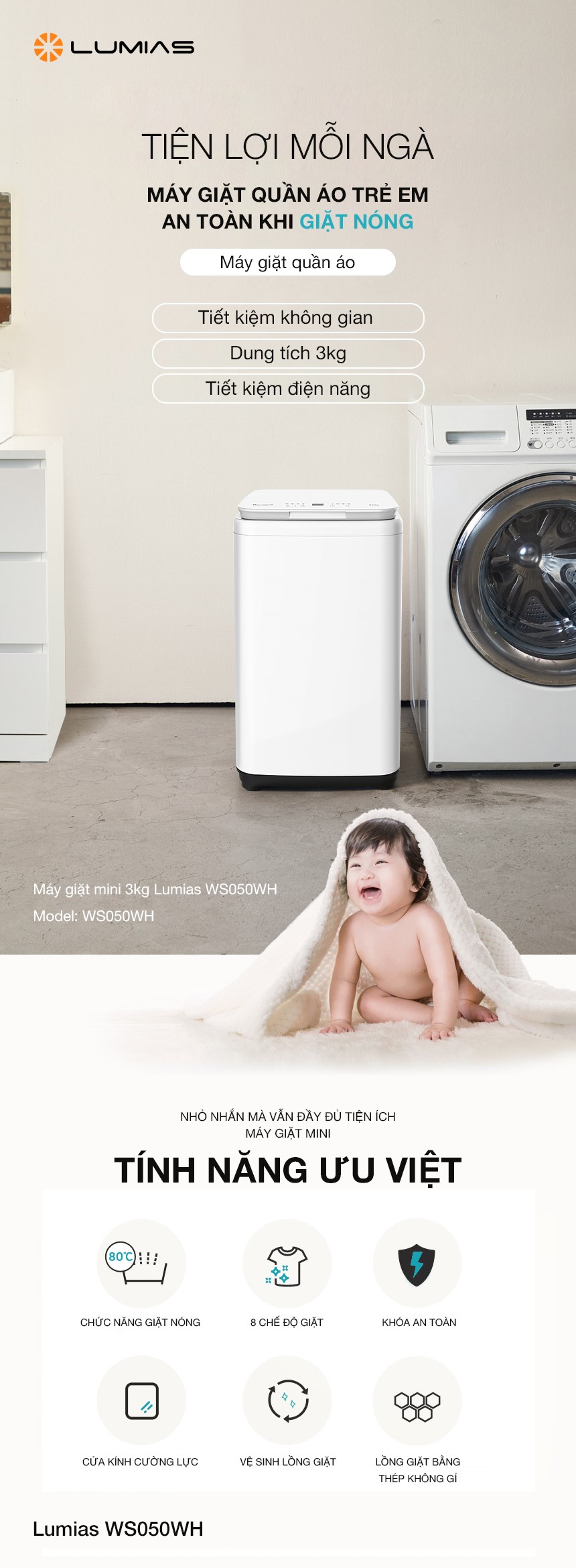 Máy giặt mini chức năng giặt nhiệt độ cao Lumias WS050WH là giải pháp lý tưởng cho không gian sống nhỏ hẹp. Với khối lượng giặt 3.0kg, thiết kế nhỏ nhắn nhưng vẫn đầy đủ tiện ích như 8 chế độ giặt cài đặt sẵn, chức năng vệ sinh lồng giặt, khóa an toàn, chế độ hẹn giờ,… Đặc biệt, máy có chức năng giặt nóng đảm bảo an toàn cho quần áo trẻ em. Lồng giặt được cấu thành từ thép không gỉ và cửa kính cường lực bền đẹp là những điểm cộng đáng chú ý. Ngoài ra máy còn được trang bị công nghệ tiên tiến giúp tiết kiệm điện năng vận hành êm ái.