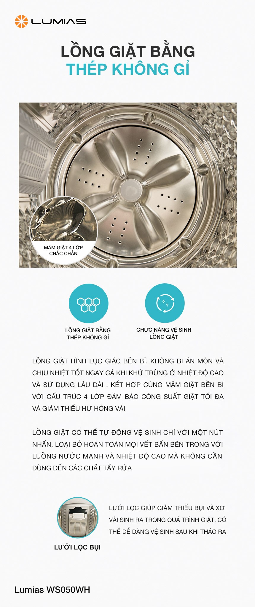 Lồng máy giặt mini Lumias WS050WH bằng thép không gỉ, mâm giặt 4 lớp
