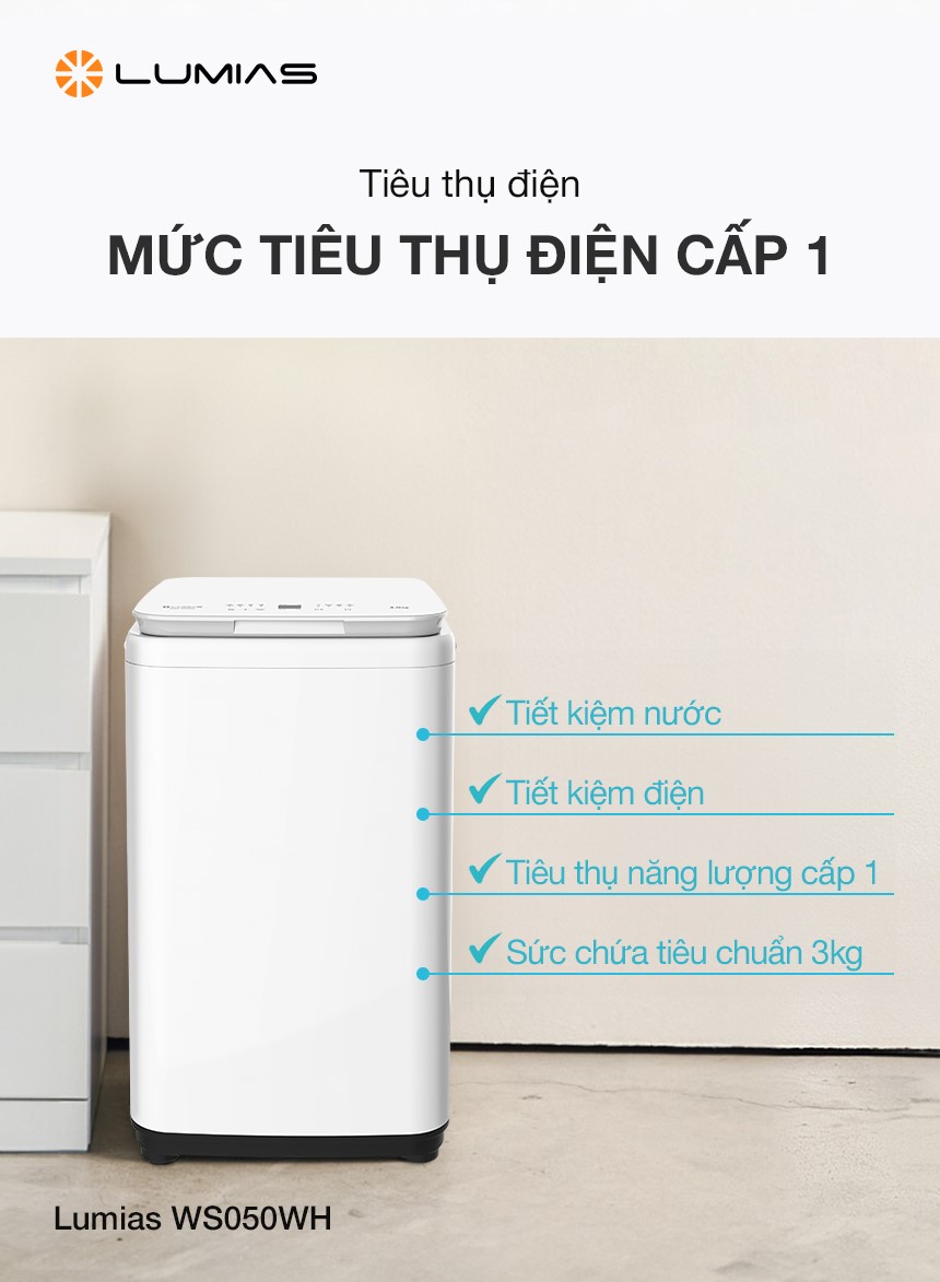 Với công nghệ giặt tiên tiến, Lumias WS050WH có sức chứa 3.0kg, đạt tiêu chuẩn tiết kiệm điện cấp 1 và tiết kiệm nước hiệu quả, giúp giảm chi phí sinh hoạt cho gia đình bạn và góp phần bảo vệ tài nguyên, môi trường.
