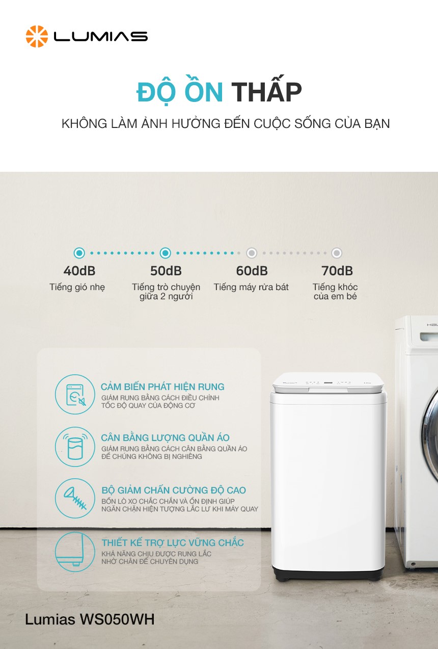 Ngoài ra, máy giặt mini giặt nhiệt độ cao Lumias WS050WH còn được trang bị nhiều công nghệ chống rung và chống ồn, như cảm biến phát hiện rung, sẽ ngay lập tức điều chỉnh tốc độ quay của động cơ để giảm rung. Tính năng tự động cân bằng lượng quần áo giúp phân bố đều, ngăn ngừa tình trạng nghiêng. Bốn lò xo giảm chấn cường độ cao ngăn chặn hiện tượng lắc lư khi máy quay, cùng với thiết kế chân đế chuyên dụng giúp tăng khả năng chịu rung. Tất đã giúp máy vận hành êm ái với độ ồn chỉ khoảng 50dB, tương đương với tiếng trò chuyện giữa hai người, mà không ảnh hưởng đến cuộc sống hàng ngày của bạn