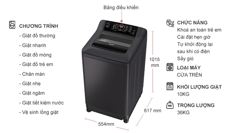 Máy giặt cửa trên Panasonic hiện có 9 chương trình giặt khác nhau cho bạn lựa chọn. Mỗi chương trình được thiết kế riêng với lượng nước, thời gian giặt tiêu chuẩn sao cho làm sạch vết bẩn trên chất liệu tương ứng như giặt thường, giặt chăn màn, đồ mỏng,… Chế độ giặt nhanh giúp giặt quần áo ít bẩn, tiết kiệm thời gian giặt.