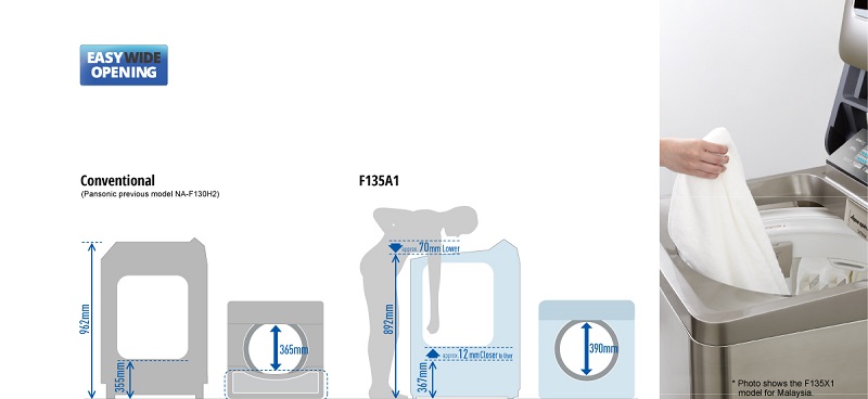 Đặc biệt thiết kế Easy Wide Opening với nắp máy giặt mở rộng, giúp cho bạn thao tác bỏ thêm hoặc lấy quần áo ra được dễ dàng, nhanh chóng.