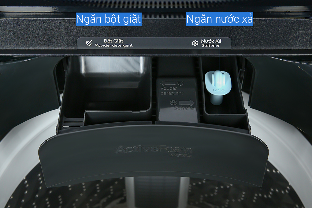 Công nghệ Active Foam đánh tan bột giặt thành hàng triệu bọt khí li ti siêu mịn, thẩm thấu vào sâu bên trong sợi vải và hòa tan các vết bẩn nhanh chóng, giảm thiểu tình trạng cặn bột giặt bám trên quần áo sau khi giặt.