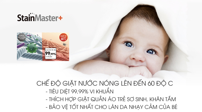 Máy giặt nước nóng giúp tăng cường hiệu quả giặt vượt trội so với các máy giặt thông thường nhờ kết hợp hiệu ứng chà và nhiệt độ nước lý tưởng. Ngoài ra, chế độ giặt nước nóng StainMaster còn giúp hạn chế vi khuẩn và các yếu tố gây dị ứng trên da.