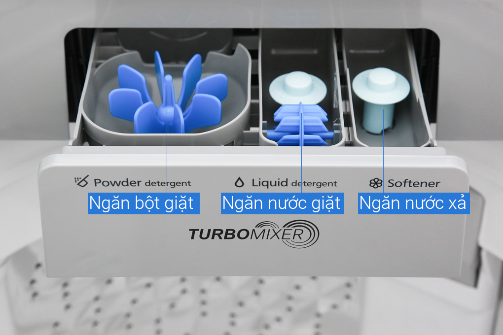 Hộp đánh tan bột giặt Turbo mixer hòa tan bột giặt để tạo bọt mịn, loại bỏ tình trạng bột giặt còn đọng lại trên quần áo mang đến hiệu quả giặt sạch vượt trội.
