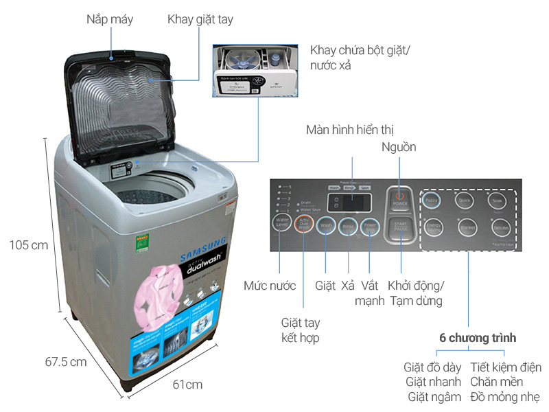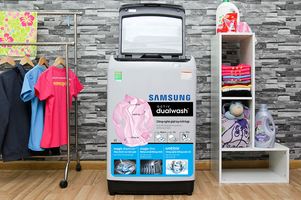 Hộp đựng bột giặt có các cánh quạt lớn giúp hoàn tan bột giặt vào nước dễ dàng hơn. Dung dịch chất giặt tẩy sẽ hòa vào dòng nước đi vào lồng giặt do đó không để lại cặn bột giặt trên quần áo.