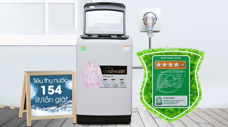 Máy giặt Samsung 10 kg WA10J5710SG/SV được gắn nhãn tiết kiệm năng lượng lên đến 5 sao nên cắt giảm chi phí điện nước của gia đình một cách đáng kể. Mỗi lần giặt máy chỉ tiêu tốn khoảng 154 lít nước.