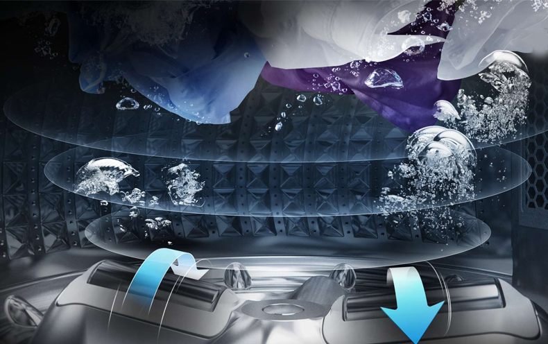 Mâm giặt Wobble giúp giặt sạch quần áo với những luồng nước đa chiều len lỏi vào từng sợi vải. Vì quần áo được luân chuyển đều đặn theo nhiều hướng khác nhau trong lồng giặt nên tình trạng xoắn rối sẽ không còn và hiệu quả giặt tẩy được nâng cao một cách rõ rệt.