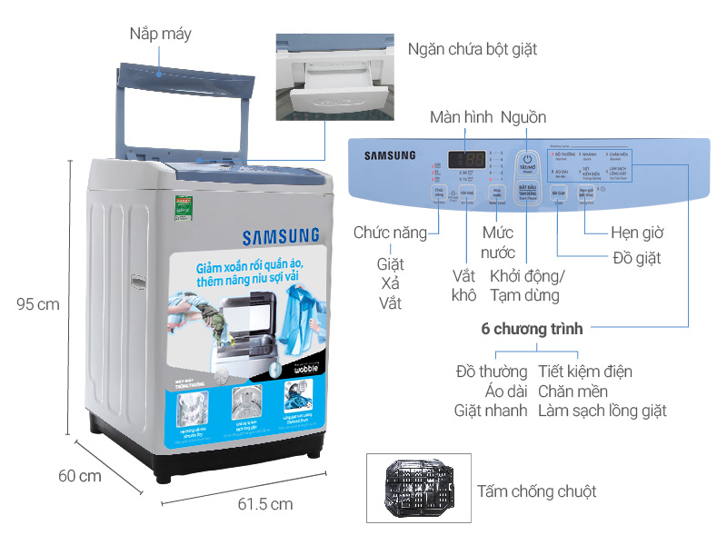 Máy giặt Samsung WA90M5120SW/SV tích hợp 6 chương trình giặt đa dạng như giặt nhanh, giặt tiết kiệm, giặt chăn mền, và đặc biệt là chương trình giặt áo dài,… giúp bạn có nhiều tùy chọn phù hợp với quần áo của gia đình, tránh tình trạng hao mòn, hư hỏng quần áo.
