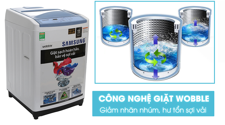 Công nghệ Wobble tạo luồng nước đa chiều là một trong những công nghệ tiên tiến được tích hợp trong sản phẩm máy giặt Samsung, hoạt động dựa trên thiết kế của mâm giặt Wobble, tạo dòng nước đa chiều len lỏi sâu vào bên trong các sợi vải, giúp đánh bật vết bẩn cứng đầu. Ngoài ra, công nghệ này giúp giảm ma sát, giảm nhăn quần áo trong quá trình giặt, giúp bảo vệ quần áo của gia đình bạn bền đẹp như mới.