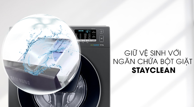 Dù chỉ là một ngăn chứa có vẻ ngoài đơn giản nhưng bên trong được thiết kế tinh xảo giữa ngăn chứa bột giặt StayClean kết hợp với hệ thống xả nước đặc biệt, cho bột giặt được hòa tan gần như hooàn toàn từ đó hạn chế tình trạng đóng cặn trên quần áo giặt, giúp ngăn chứa luôn được giữ vệ sinh sạch sẽ.