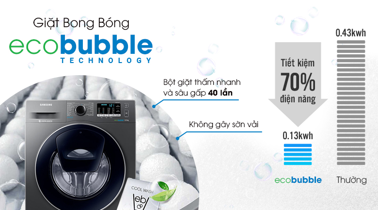Công nghệ giặt bong bóng Eco Bubble là một điểm cộng to lớn dành cho chiếc máy giặt mang thương hiệu Hàn Quốc này. Với Eco Bubble, xà phòng sẽ được đánh tan thành dạng bọt mịn, thẩm thấu sâu vào quần áo, loại bỏ mọi vết bẩn cứng đầu nhất nhưng vẫn tiết kiệm xà phòng hơn so với các công nghệ giặt thông thường khác.
