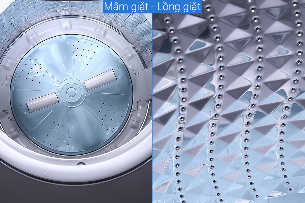 Trong quá trình giặt, quần áo sẽ được ma sát nhẹ nhàng trên bề mặt của lồng giặt kim cương, vừa mang lại hiệu quả giặt sạch vừa giảm thiểu sự hư tổn sợi vải sau khi giặt.