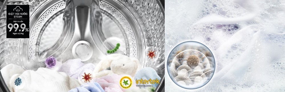 Giặt hơi nước Hygiene Steam diệt khuẩn đến 99.9%: Hơi nước nhiệt độ cao thẩm thấu sâu vào từng sợi vải, không chỉ giúp loại bỏ vết bẩn cứng đầu mà còn tiêu diệt vi khuẩn và tác nhân gây dị ứng, mang lại sự an tâm cho sức khỏe gia đình.