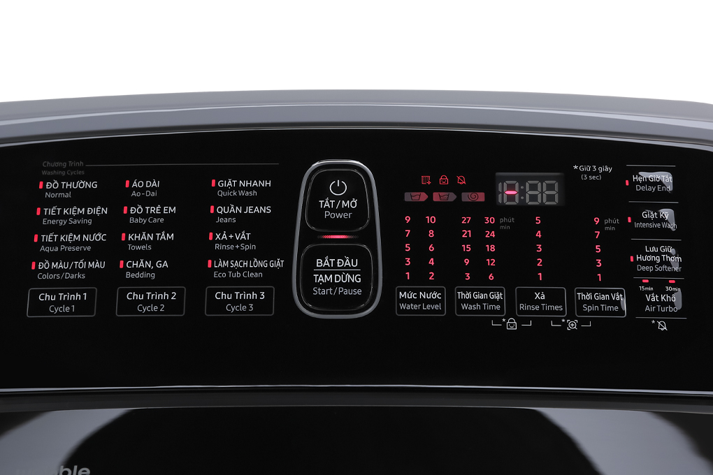 Máy giặt được trang bị sẵn 12 chương trình giặt gồm 8 chương trình thường dùng như: giặt nhanh, giặt áo dài, giặt thường, đồ tối màu, đồ trẻ em, chăn ga, vệ sinh lồng giặt và 5 chương trình khác (Xem chi tiết tại bảng thông số kỹ thuật)