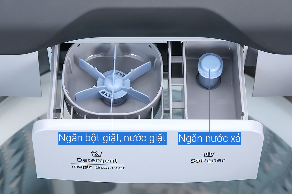 Nhờ hộp Magic Dispenser được thiết kế cánh quạt xoay kết hợp với lực nước mạnh, bột giặt sẽ được đánh tan hoàn toàn, hạn chế được tình trạng đóng cặn bột giặt bám trên quần áo, không còn gây khó chịu và cảm giác ngứa mỗi khi bạn mặc quần áo.