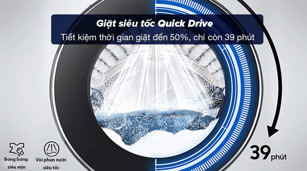 – Chế độ giặt siêu tốc Quick Drive: Sử dụng lực nước mạnh mẽ với vòi phun nước siêu tốc, giúp bong bóng xà phòng tăng nhanh quá trình thẩm thấu vào bên trong sợi vải. Nhờ đó, vết bẩn được loại bỏ hiệu quả và tiết kiệm thời gian giặt đến 50%, mất khoảng 39 phút để hoàn tất chu trình giặt xả.