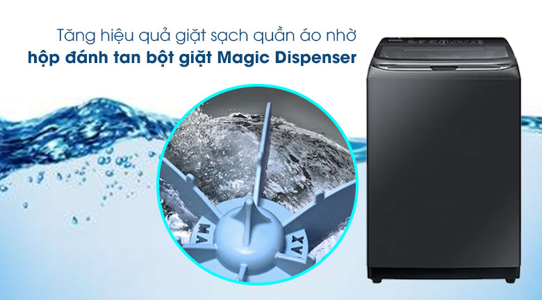 Hộp đánh tan bột giặt Magic Dispenser được tích hợp trong ngăn chứa bột giặt, với cánh quạt xoay tạo dòng nước xoáy mạnh để đánh tan bột giặt trước khi đổ xuống lồng giặt, giúp bột giặt len lỏi vào từng sợi vải và bột không đọng cặn trên quần áo. Bạn sẽ không còn lo lắng về vấn đề cặn bột giặt còn sót lại dính vào quần áo khiến bạn bị dị ứng.
