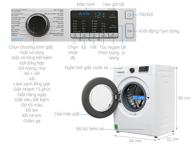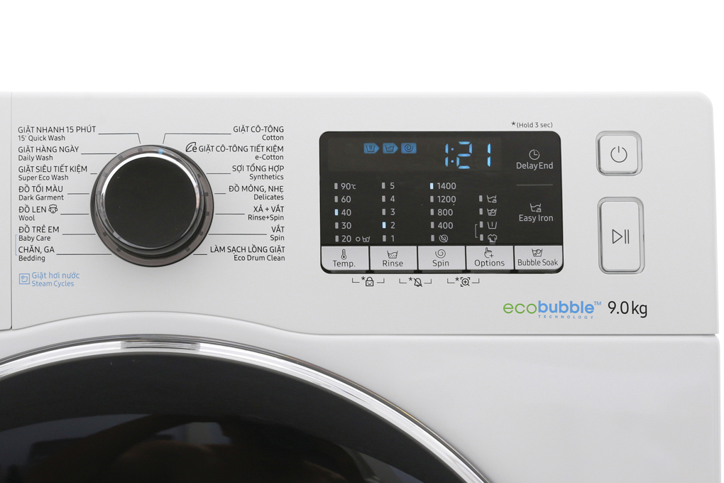 Công nghệ giặt hơi nước được trang bị trên máy giặt WW90J54E0BW/SV hoạt động như sau: nước sẽ được đun nóng thành hơi và phun liên tục vào quần áo kết hợp với chuyển động quay của máy giặt Inverter. Nhiệt độ cao của hơi nước sẽ loại bỏ các vi khuẩn cũng như các tác nhân gây dị ứng và dễ dàng đánh bật các vết bẩn trên quần áo, chăn màn,…