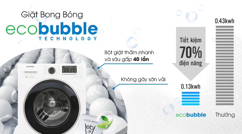Cơ chế hoạt động của công nghệ Eco Bubble là thiết bị tạo bong bóng hòa tan bột giặt vào nước và bơm khí vào tạo ra nhiều bọt xà phòng giúp xà phòng thẩm thấu vào từng sợi vải, đánh bật các vết bẩn cứng đầu trên quần áo của bạn mang lại hiệu quả giặt sạch sâu. Bên cạnh đó, công nghệ này còn giúp tiết kiệm điện tối đa khi có thể giặt ở nhiệt độ thường mà không cần phải sử dụng đến nước nóng như các công nghệ cũ.