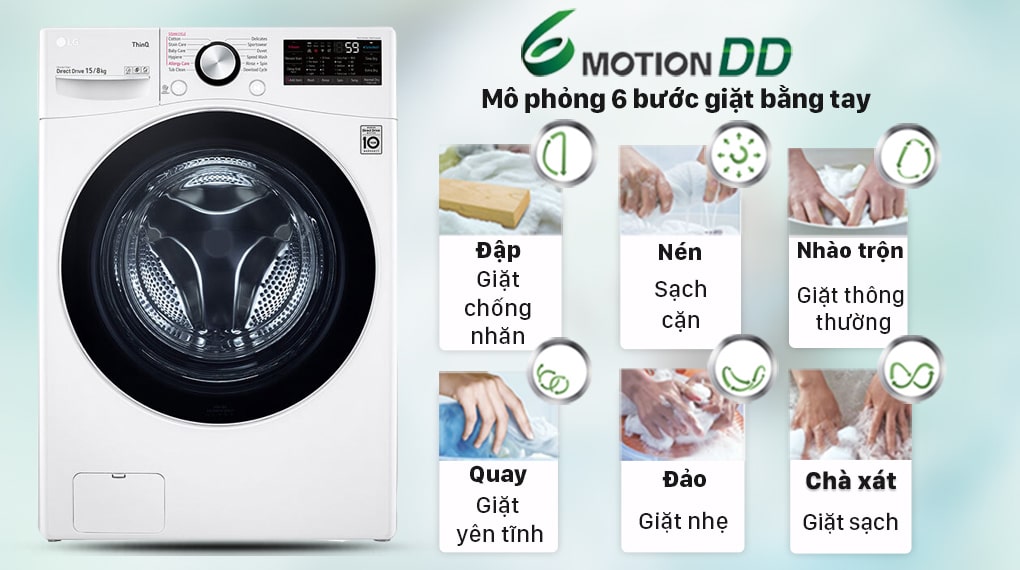 Chiếc máy giặt LG lồng ngang còn được trang bị công nghệ giặt 6 chuyển động, nghĩa là quần áo sẽ được làm sạch hiệu quả giống như đang giặt tay thông qua cơ chế điều khiển tốc độ và hướng quay của lồng giặt như: nhào trộn, đập, nén, đảo, quay và chà xát để mô phỏng lại các thao tác giặt tay của con người.