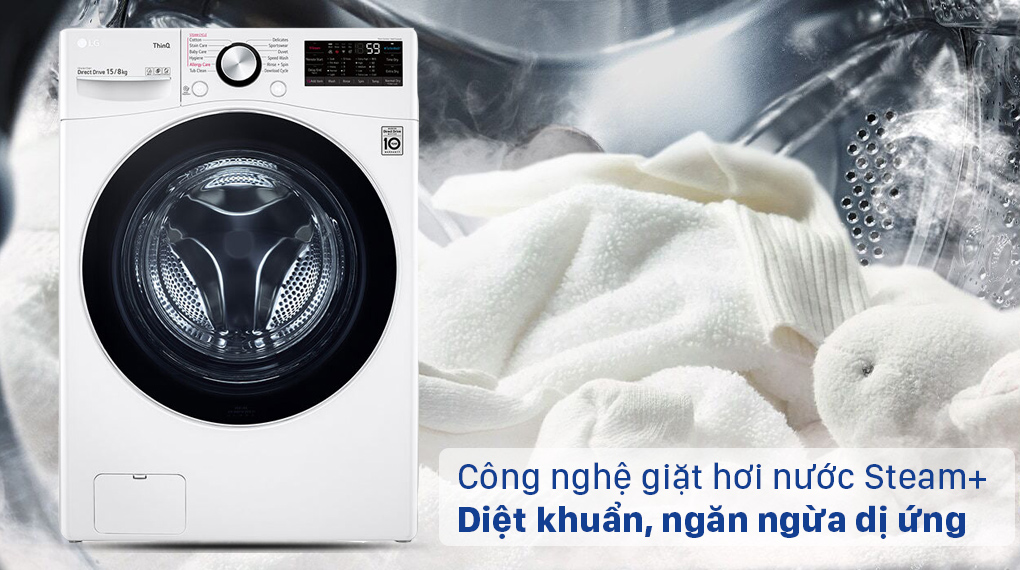 Với công nghệ giặt hơi nước Steam+, nhiệt độ từ hơi nước sẽ thẩm thấu vào sâu bên trong và loại bỏ các vết bẩn cứng đầu bám trên quần áo. Đồng thời, sức nóng của hơi nước còn có khả năng diệt khuẩn và loại bỏ các tác nhân gây dị ứng.
