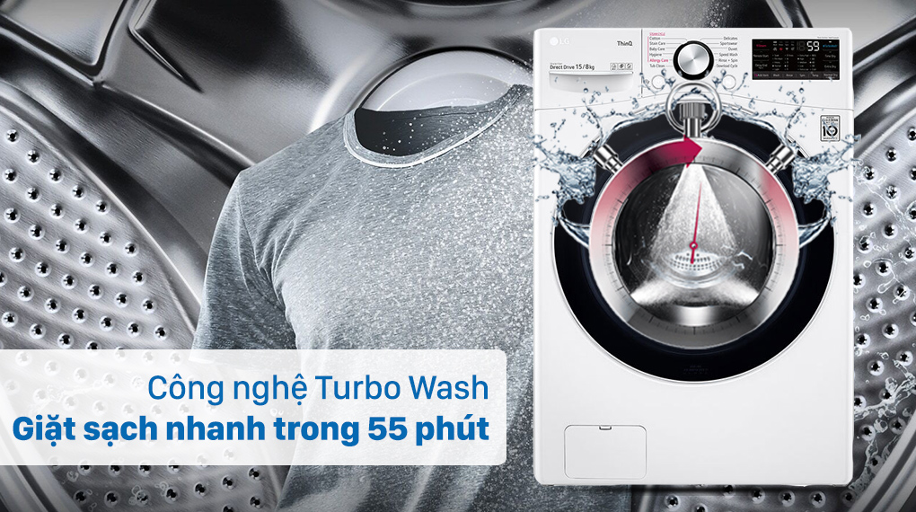 Với chế độ TurboWash, quá trình giặt giũ chỉ diễn ra trong 55 phút mà quần áo vẫn sạch tinh tươm, thực sự phù hợp cho những cá nhân có cuộc sống bận rộn.
