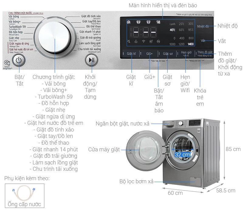 • Tiện ích:Giặt nước nóng, Khóa trẻ em, Giặt hơi nước, Cho phép điều khiển máy giặt từ xa qua ứng dụng SmartThinQ