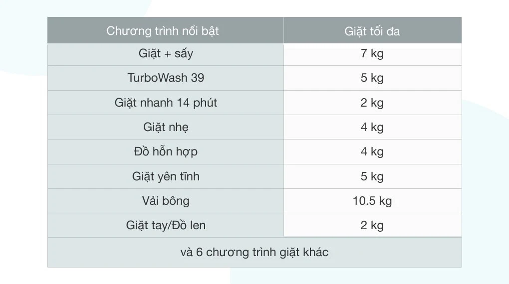 Bên cạnh đó, máy giặt được tích hợp sẵn 8 chương trình giặt nổi bật, bao gồm: giặt + sấy, TurboWash 39, giặt nhanh 14 phút, giặt nhẹ, đồ hỗn hợp, giặt yên tĩnh, vải bông, giặt tay/đồ len. Trong đó, chương trình giặt yên tĩnh giúp hạn chế tiếng ồn trong quá trình máy hoạt động, mang lại sự yên tĩnh, êm ái cho ngôi nhà của bạn. (Xem chi tiết tại bảng TSKT)