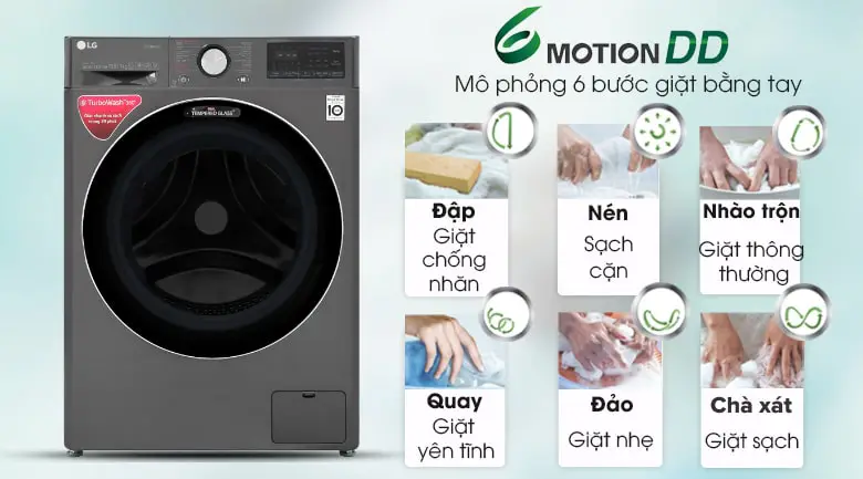 • Công nghệ giặt: Công nghệ giặt hơi nước Steam+, Công nghệ giặt TurboWash, Giặt 6 chuyển động