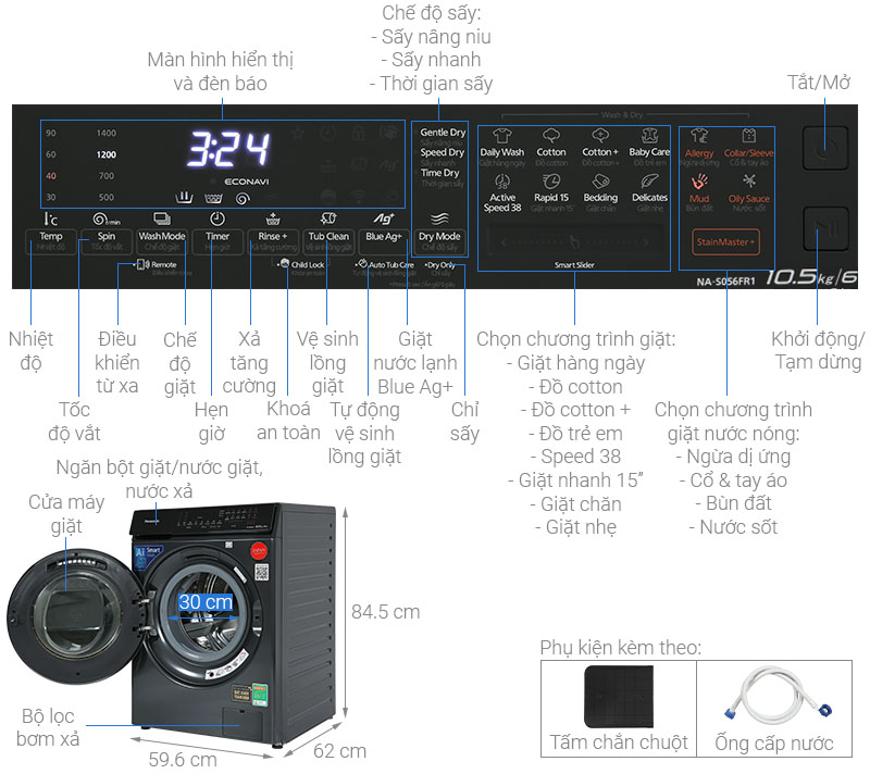 Tóm lại, máy giặt sấy Panasonic Inverter 10.5 kg NA-S056FR1BV có bảng điều khiển hiện đại, hỗ trợ công nghệ giặt tiên tiến như UV Blue Ag+ cho khả năng diệt khuẩn cao, công nghệ giặt nước nóng StainMaster+ đánh bật các vết bẩn cứng đầu, tăng hiệu suất làm sạch và tiết kiệm điện năng với công nghệ 3Di Inverter và cảm biến Econavi, có 16 chương trình giặt cài đặt sẵn tiện dụng, điều khiển dễ dàng qua Smartphone, cho khối lượng giặt 10.5 kg, khối lượng sấy 6 kg, sản phẩm phù hợp với gia đình có trên 7 người.