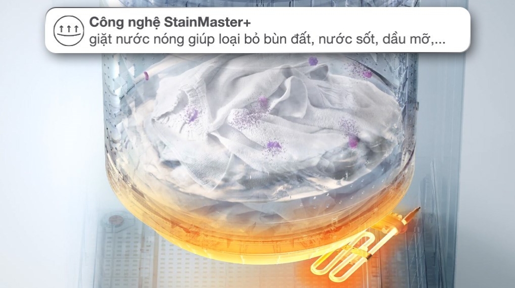 – Công nghệ StainMaster+ giặt nước nóng xử lý hiệu quả các vết bẩn cứng đầu như dầu mỡ, bùn đất, cổ áo… nhờ nhiệt độ nước kiểm soát chính xác, giúp tăng khả năng giặt sạch mà vẫn dịu nhẹ với sợi vải.
