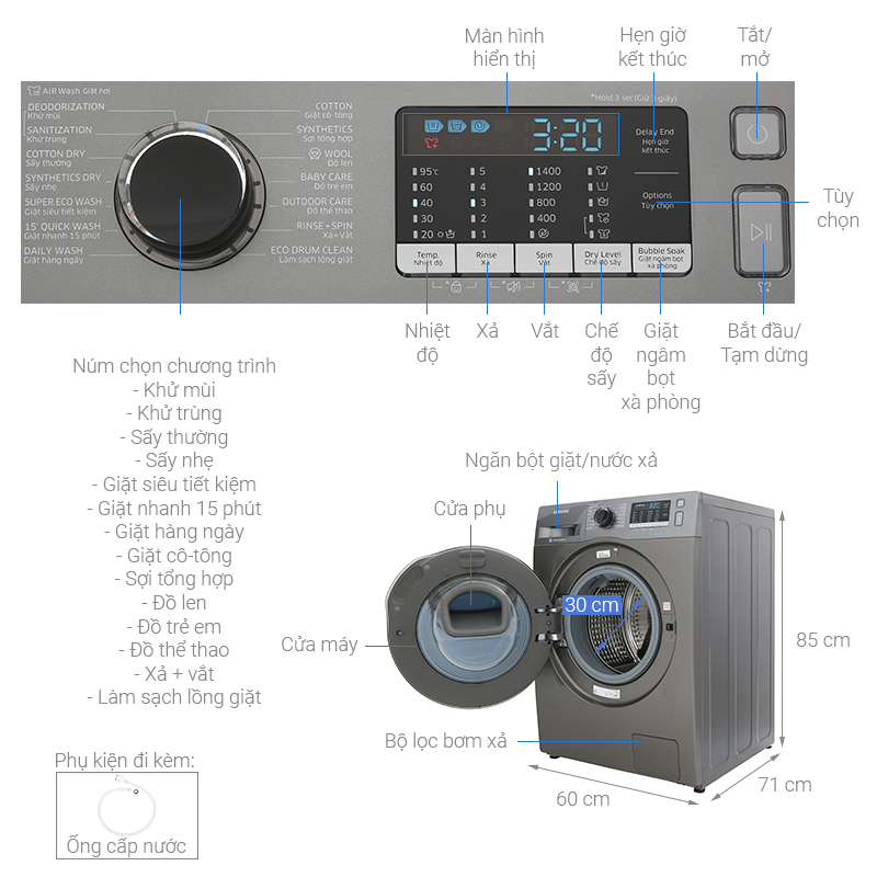 Máy giặt sấy Samsung AddWash Inverter 8 kg WD85K5410OX/SV được thiết kế hiện đại với cửa trước bằng kính pha lê trong suốt, lồng ngang tiện lợi cho bạn trong việc sử dụng, kết hợp tông màu đen xám sang trọng, tinh tế và nổi bật, dễ dàng gây ấn tượng thu hút ánh nhìn của bạn và mọi người.