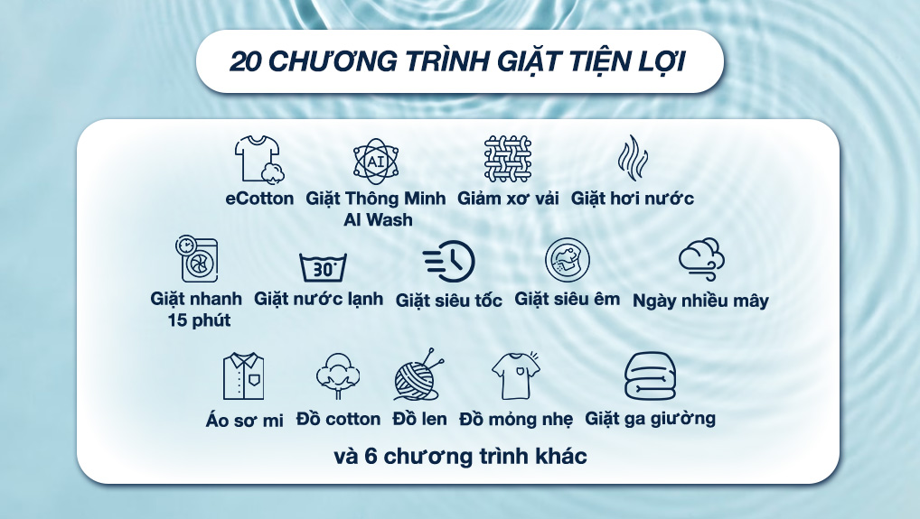 – Tích hợp sẵn 20 chương trình giặt: Giặt siêu tốc, giặt hơi nước, giặt nhanh 15 phút, giặt đồ cotton,… (xem thêm tại thông số kỹ thuật). Chương trình giặt nhanh 15 phút phù hợp cho quần áo ít bẩn, khối lượng quần áo ít.