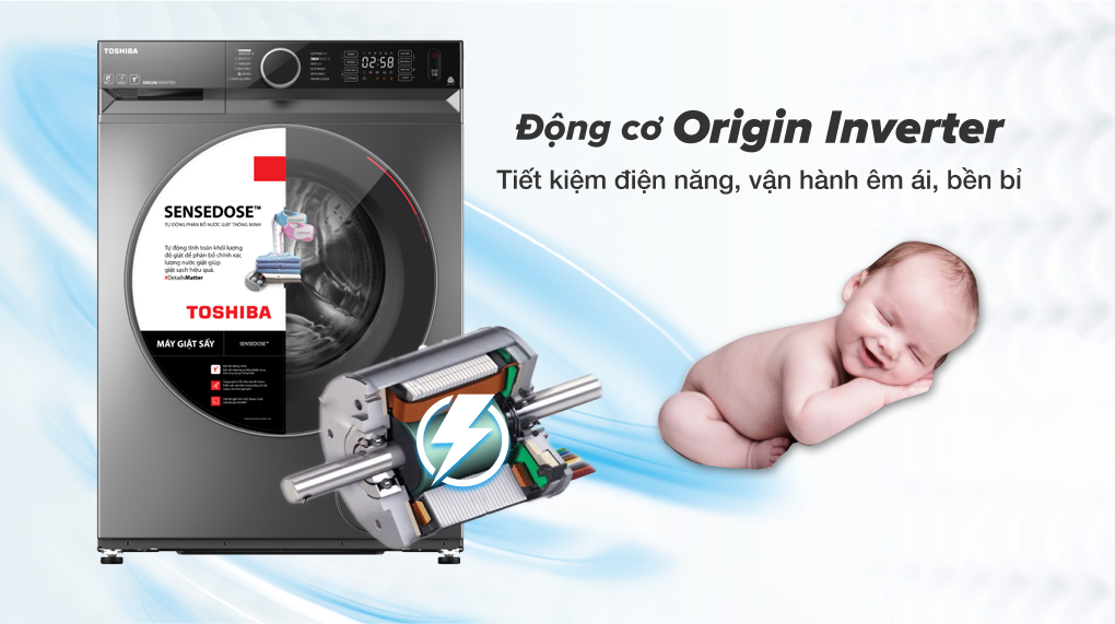 – Động cơ nam châm vĩnh cửu truyền động dây Curoa bền bỉ kết hợp công nghệ Origin Inverter cho thiết bị vận hành mượt mà, đảm bảo hiệu suất giặt mạnh mẽ, tiết kiệm điện năng đáng kể, giúp tối ưu chi phí sinh hoạt hằng tháng cho gia đình.