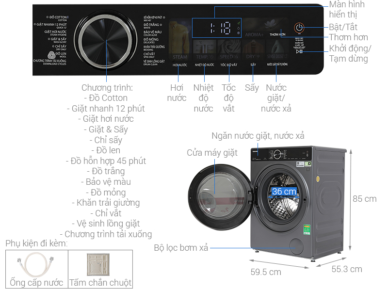 Tóm lại, máy giặt sấy Toshiba Inverter giặt 10,5 kg – sấy 7 kg TWD-T25BZU115MWV(MG) có kiểu dáng hiện đại, dễ sử dụng và quan sát với bảng điều khiển cảm ứng đa màu lạ mắt. Hơn nữa, sản phẩm có khả năng tiết kiệm điện nước và đảm bảo hiệu quả giặt sạch tối ưu nhờ công nghệ thông minh AI và các công nghệ giặt khác.