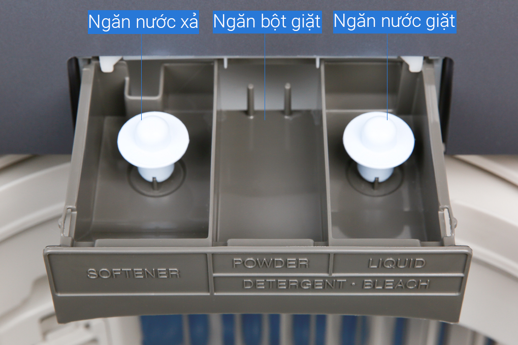 Máy giặt Sharp tích hợp chất giặt tẩy dạng bột, dạng lỏng và nước xả vải trong cùng một ngăn chứa giúp tiện lợi hơn trong việc sử dụng.