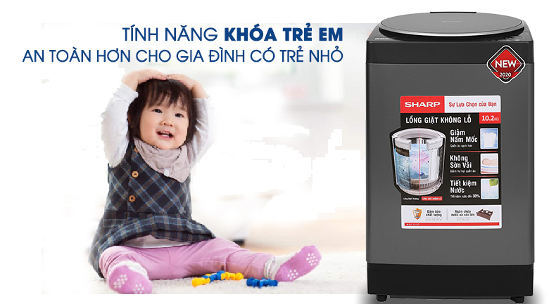 Chức này này giúp máy giặt Sharp cửa trên es-x105hv-s khóa bàn phím lúc máy đang vận hành để tránh trẻ em nghịch phá. Ngoài ra, sẽ phát ra tiếng kêu và xả nước ra bên ngoài nếu mở cửa giật quá lâu, đảm bảo an toàn cho gia đình có trẻ nhỏ.