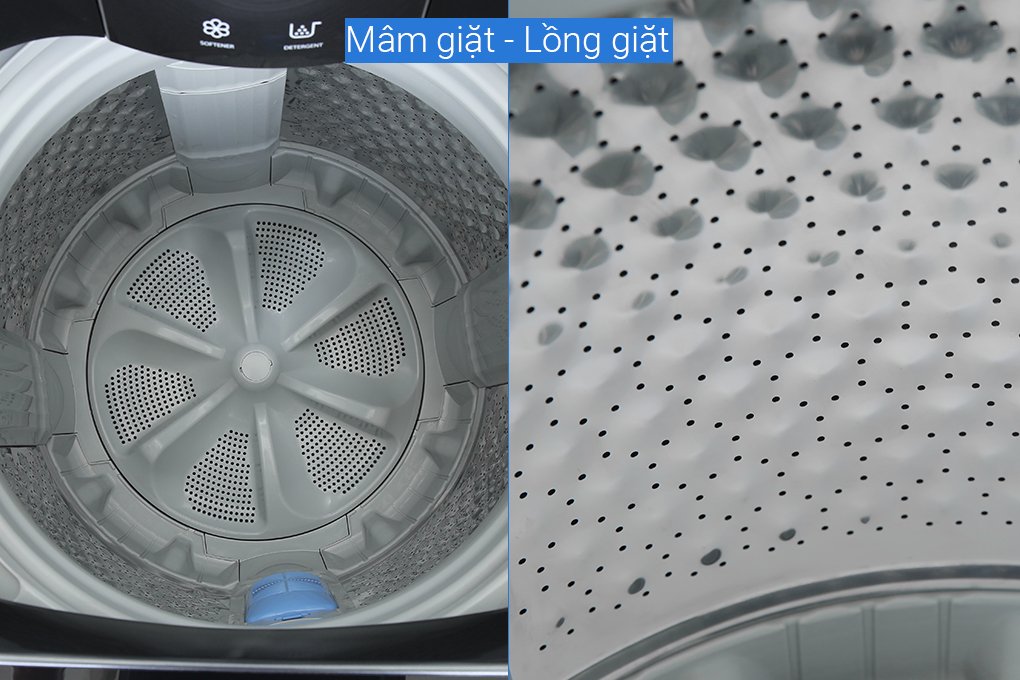 Lồng giặt của máy giặt Toshiba có thiết kế đặc biệt với các gờ nổi hình ngôi sao, xen kẽ đó là các lỗ nhỏ dẫn nước len lỏi khắp lồng giặt. Các gờ nổi sẽ tác động một cách nhẹ nhàng lên áo quần, cho hiệu quả giặt sạch tăng lên 5% mà không gây hư hại quần áo.