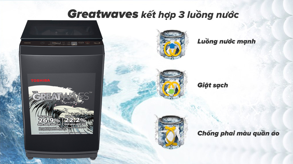 – Công nghệ giặt siêu sóng Greatwaves: với sự kết hợp 3 luồng nước cùng các tia nước tạo ra từ lỗ phun của máy giặt Toshiba, thiết bị kiến tạo luồng nước siêu mạnh giúp phân tách quần áo, chống xoắn rối, loại bỏ vết bẩn, cặn xà phòng, giúp giặt sạch và bảo vệ chất liệu vải.