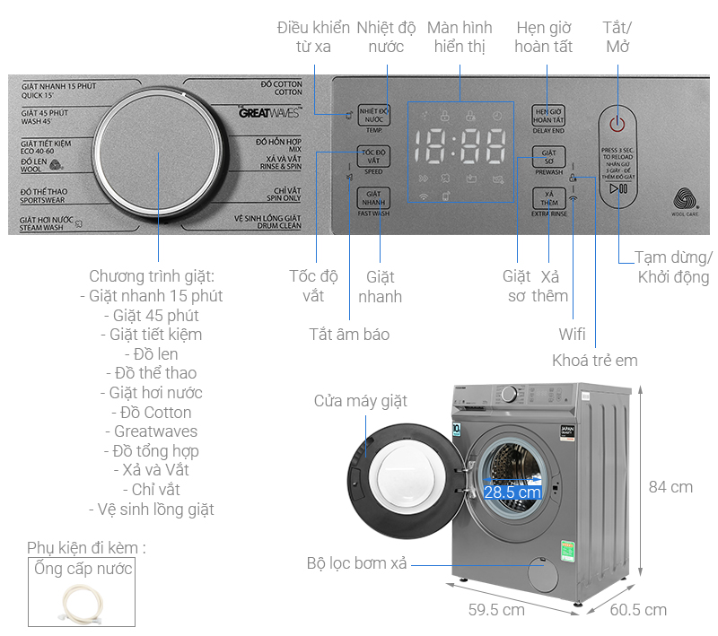 Các chương trình giặt bao gồm: Đồ cotton, Greatwaves, Đồ hỗn hợp, Xả và vắt, Chỉ vắt, Vệ sinh lồng giặt, Giặt hơi nước, Đồ thể thao, Đồ len, Giặt tiết kiệm, Giặt 45 phút, Giặt nhanh 15 phút, tùy vào từng loại quần áo, đồ dùng và nhu cầu giặt giũ của mình mà bạn lựa chọn chương trình giặt phù hợp qua bảng điều khiển cảm ứng có nút xoay hỗ trợ song ngữ tiếng Anh – Việt kèm màn hình hiển thị sắc nét, dễ dàng quan sát và tùy chọn chức năng.