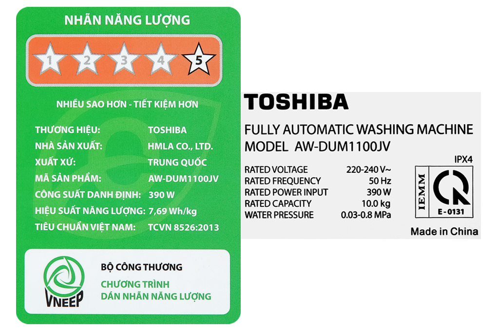 – Máy giặt Toshiba có nhãn năng lượng đạt chuẩn 5 sao, hiệu suất sử dụng điện 7.69 Wh/kg.