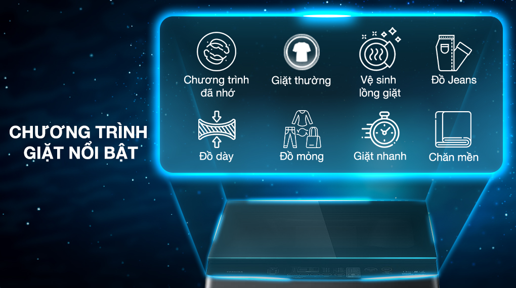 – Sản phẩm được tích hợp sẵn 8 chương trình giặt tự động bao gồm: giặt thường, chăn mền, đồ Jeans, đồ dày, đồ mỏng, giặt nhanh, chương trình đã nhớ và vệ sinh lồng giặt.