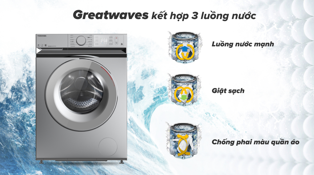 Chiếc máy giặt này được tích hợp công nghệ Greatwaves siêu sóng độc quyền của Toshiba, giúp đánh bật vết bẩn cứng đầu cũng như hạn chế độ phai màu của quần áo sau khi giặt.
