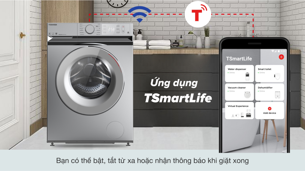 Ứng dụng TSmartLife giúp bạn điều khiển máy giặt từ xa thông qua chiếc điện thoại thông minh, giúp bạn dễ dàng theo dõi trạng thái hoạt động của máy, hẹn giờ giặt hoặc lựa chọn chương trình giặt phù hợp.