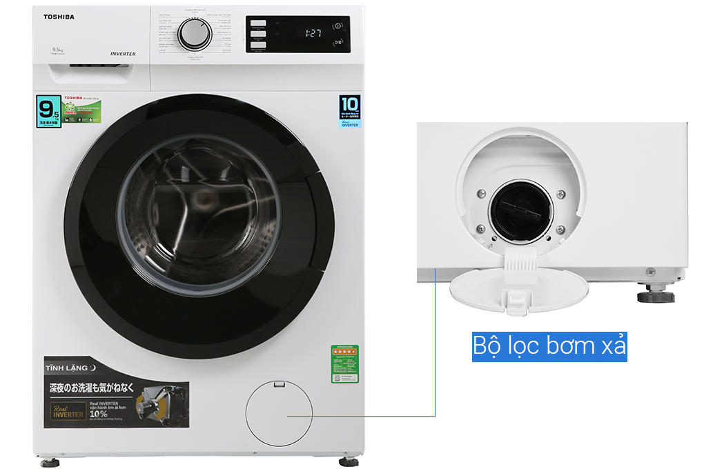 Bên cạnh đó, máy giặt Toshiba Inverter TW-BK105S2V(WS) sở hữu khối lượng giặt đến 9.5 kg, thích hợp cho những hộ gia đình có trên 6 người, hoặc ít hơn nhưng lại có nhu cầu làm sạch quần áo nhiều trong mỗi lần giặt.