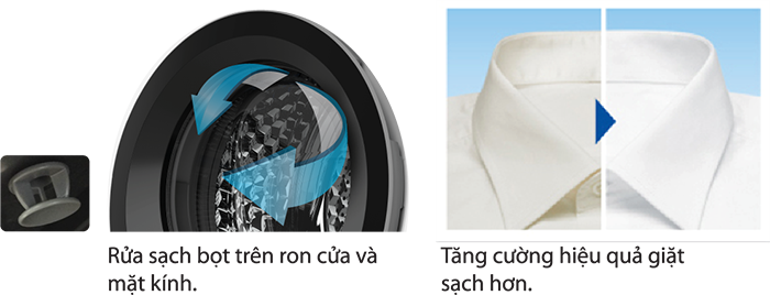 Chiếc máy giặt Toshiba Inverter này có tính năng phun nước 360º giúp làm tan bột giặt nhanh chóng, rửa sạch bọt trên ron cửa và mặt kính, từ đó tiết kiệm thời gian làm vệ sinh, lau chùi.