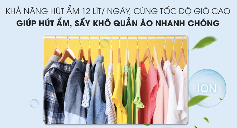Máy vận hành quạt với tốc độ tối đa kết hợp tính năng hút ẩm nhanh chóng, nhằm hút sạch hơi nước trong quần áo giúp cho việc hong khô trở nên nhanh chóng và hiệu quả hơn.