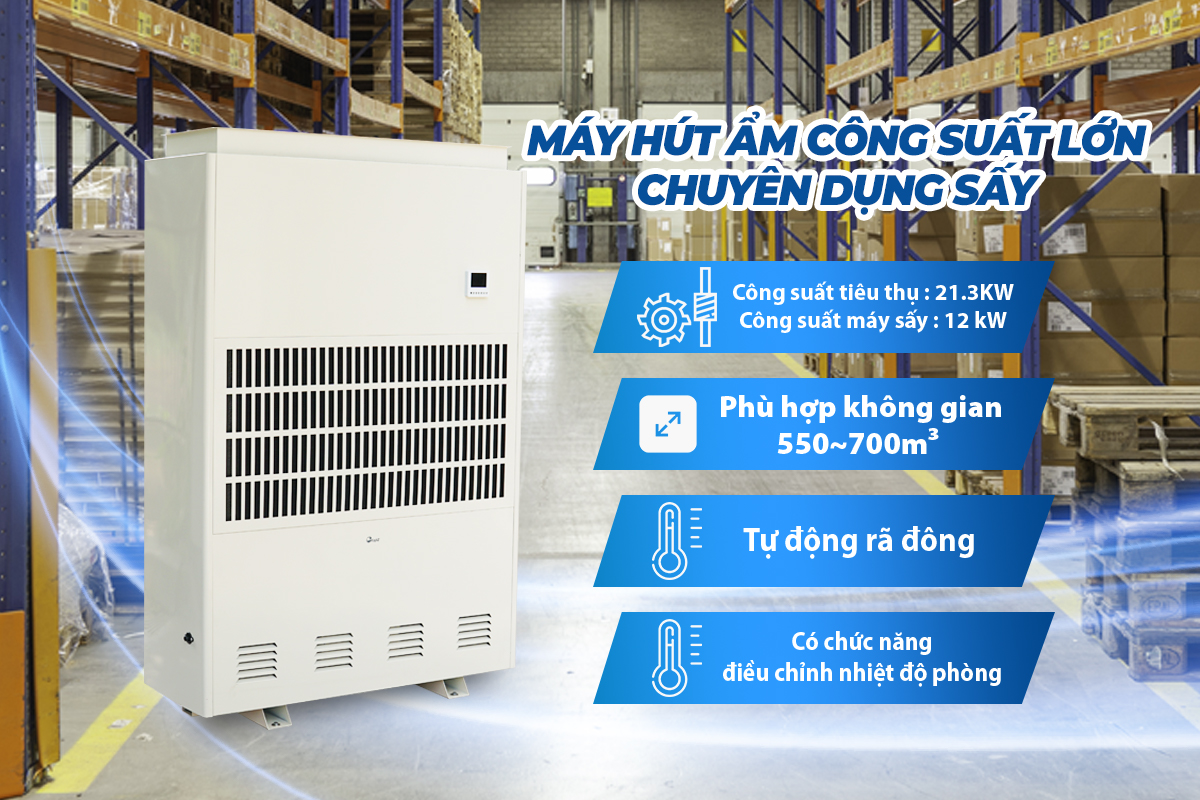 Dòng máy hút ẩm cao cấp chuyên sử dụng cho nhu cầu sấy và bảo quản nông hải sản . Máy có thể hút ẩm và gia tăng nhiệt độ (sử dụng hệ thống sấy PTC)trong môi trường nhiệt độ cao ( lên tới 60℃ ). Thích hợp sử dụng hút ẩm cho các phòng có diện tích từ 550~700m³ để sấy bảo quản : Gỗ,Ngũ cốc,Hạt ,Nấm ăn được ,Rau và Trái cây ,Hải sản ,Trà ,Gốm sứ ,Thuốc ,v.v.
